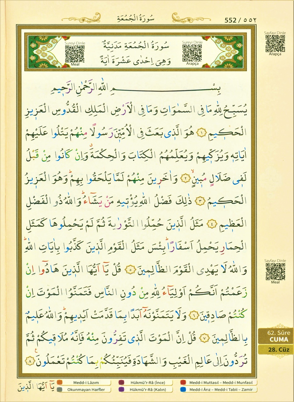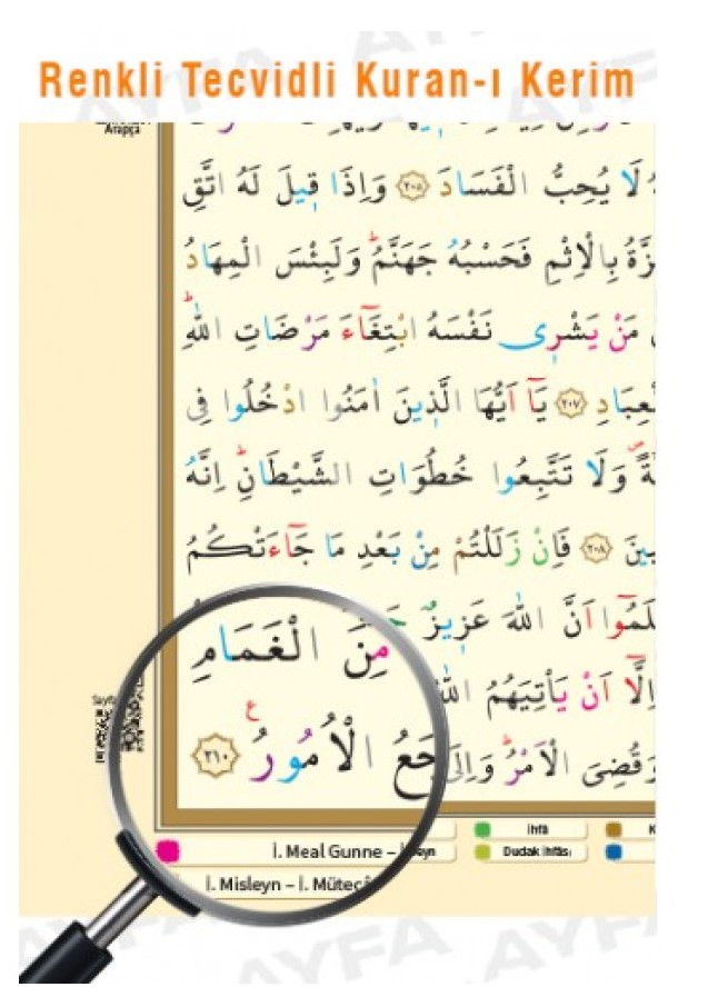 Her sayfanın alt tarafında tecvid kurallarını ifade eden renkler