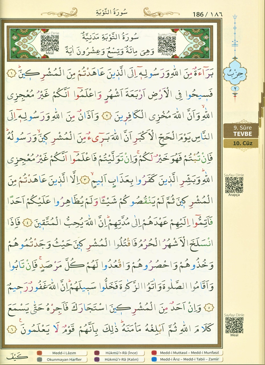 Her sayfanın alt tarafında tecvid kurallarını ifade eden renkler
