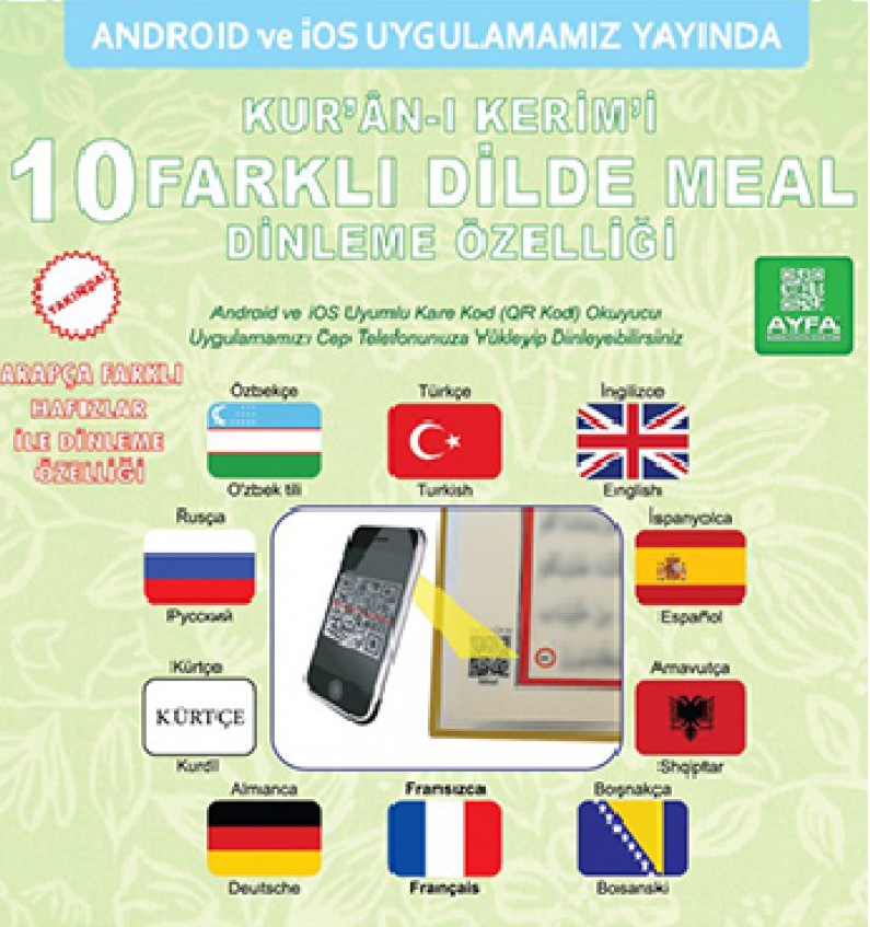 Android ve IOS Uyumlu ( QR Kod ) Kare Kod Okuyucu Uygulaması ile Cep telefonu ile Kuran dinleme, İster sayfa sayfa, ister sure sure, ister cüz cüz olarak dinleme özelliği, Kuranı Kerimin Türkçe Mealini dinleme